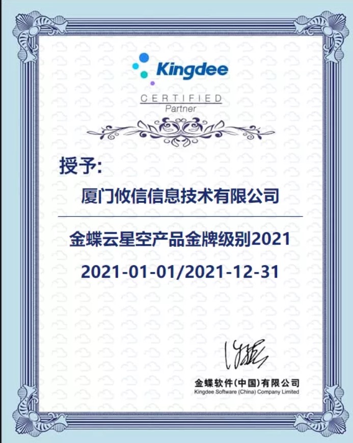 發(fā)證機構(gòu):   金蝶(軟件)中國有限公司 發(fā)證時間 :   2021-01-01
