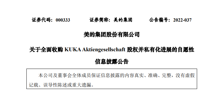 2021年11月,美的集團發布公告稱,擬全面收購庫卡股權,收購完成后,庫卡將成為美的全資控股的境外子公司,并從法蘭克福交易所退市。