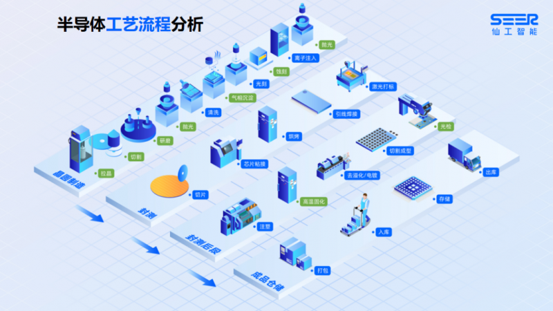 上圖為半導(dǎo)體整個(gè)工藝流程,圖表中清晰標(biāo)注了仙工智能在整個(gè)半導(dǎo)體生產(chǎn)制程中能做的工作,包括清洗、光刻、離子注入、封測(cè)整個(gè)環(huán)節(jié)、除高溫固化和光檢以外的封測(cè)后段環(huán)節(jié)、成品倉(cāng)儲(chǔ)整個(gè)環(huán)節(jié),上述環(huán)節(jié)均使用仙工智能自有的解決方案。