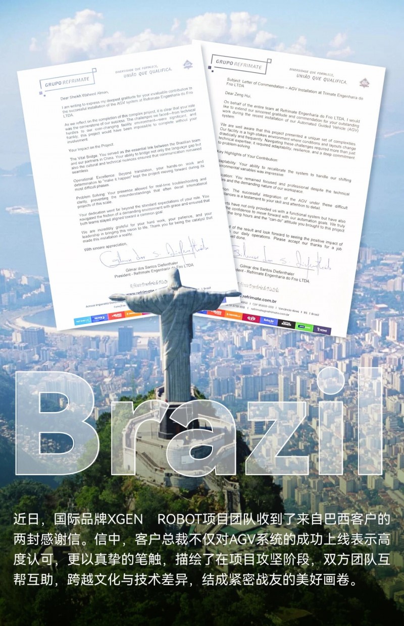 這兩封來自巴西項目的感謝信,不僅是對一次技術交付的肯定,更是對公司“以客戶為中心”服務模式的信任背書,是XGEN ROBOT在全球智慧物流領域深耕的縮影。未來,XGEN ROBOT將以更專業的技術支持、更深度的客戶協同和更細致的價值陪伴,在全球范圍內,書寫一個又一個關于信任、挑戰與共贏的故事。