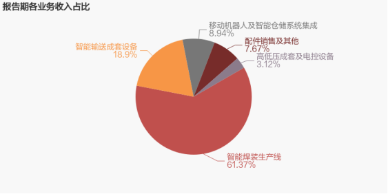 從業(yè)務(wù)結(jié)構(gòu)來看,“智能焊裝生產(chǎn)線”是公司營業(yè)收入的主要來源。具體而言,“智能焊裝生產(chǎn)線”營業(yè)收入為4.18億元,營收占比為61.4%,毛利率為13%。