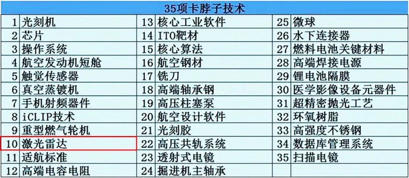 2018年《科技日報》總結(jié)了制約我國工業(yè)發(fā)展的35項“卡脖子”技術(shù),其中第十項是激光雷達(dá)技術(shù)。
