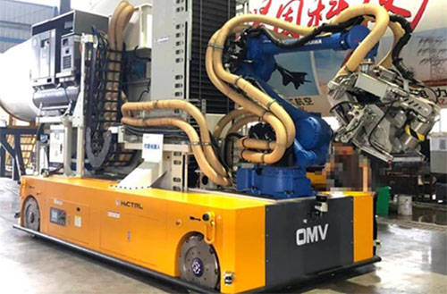 除了物料搬運(yùn)外,在重載移動機(jī)器人底盤上加裝上端機(jī)械臂和其他組件,也可以讓AGV進(jìn)入到生產(chǎn)環(huán)節(jié),相當(dāng)于是給機(jī)械臂加上了“雙腳”。如在風(fēng)力發(fā)電葉片打磨領(lǐng)域,運(yùn)用復(fù)合型AGV便可以實(shí)現(xiàn)葉片的全自動化打磨,其中無需人工操作,且內(nèi)置的力控系統(tǒng)可以保證打磨時恒力接觸,從而保證了葉片的質(zhì)量;同時,葉片打磨復(fù)合型AGV在打磨頭上裝備紅外線測距感應(yīng)器,實(shí)時監(jiān)控,有效確保了打磨精度。風(fēng)電行業(yè)中的復(fù)合型重載AGV,除了可以適應(yīng)葉片打磨的工作,稍加改裝,還可以應(yīng)用于葉片根部雙頭螺栓的安裝與檢測等安裝工作,進(jìn)一步取代人工,提升企業(yè)know-how。