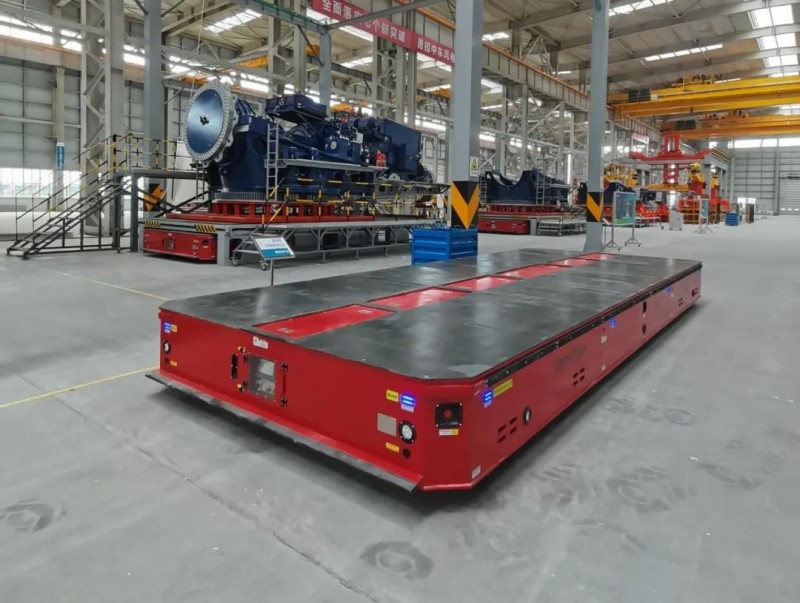 在這之中,50T重載AGV和兼容性工裝實(shí)現(xiàn)生產(chǎn)過程中的場外大件物料自動化搬運(yùn),滿足車間每日產(chǎn)能需求,提供高效的信息流,實(shí)現(xiàn)物料配送的自動化、準(zhǔn)時化和可視化,滿足指定的位置準(zhǔn)確取放物料,提高物料配送效率;而200T重載AGV和兼容性工裝則用于實(shí)現(xiàn)主機(jī)下線和傳動鏈廠轉(zhuǎn)運(yùn)的半自動化搬運(yùn),借助導(dǎo)航系統(tǒng),實(shí)現(xiàn)了AGV運(yùn)輸過程循跡行駛功能,并通過光電等裝置,實(shí)現(xiàn)AGV與工裝自動對準(zhǔn)調(diào)正的功能,完成傳動鏈轉(zhuǎn)運(yùn)和主機(jī)下線、轉(zhuǎn)運(yùn)的任務(wù)要求。兩種機(jī)型均可自適應(yīng)室外復(fù)雜地面,搭載多重安全防護(hù)系統(tǒng)與智能液壓系統(tǒng),保障現(xiàn)場產(chǎn)品與人員的安全。