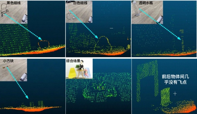 實拍場景與3D點云,可以看到dToF不僅在綜合場景中表現優秀,對小物體,細線甚至透明物體等極端場景都有非常好的表現,并且相對于其他ToF技術,dToF在飛點(前后物體邊界難以區分造成的)的表現上有天然優勢。![]()