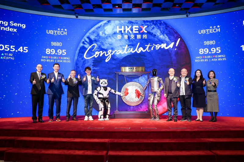 圖片1:從左至右依次為:香港交易所聯(lián)席營運(yùn)總監(jiān)陳翊庭,香港聯(lián)交所上市委員會(huì)主席Renu BHATIA,優(yōu)必選董事會(huì)主席、執(zhí)行董事兼行政總裁周劍,香港創(chuàng)新科技及工業(yè)局局長孫東,香港引進(jìn)重點(diǎn)企業(yè)辦公室執(zhí)行總裁吳國才及機(jī)器人合影