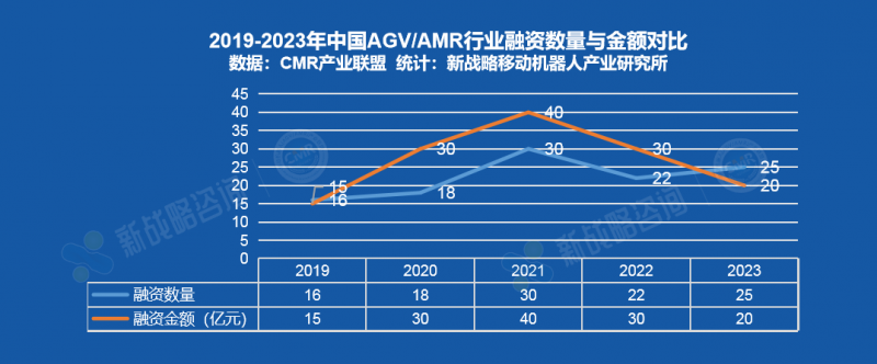 根據(jù)CMR產(chǎn)業(yè)聯(lián)盟數(shù)據(jù),新戰(zhàn)略移動機器人產(chǎn)業(yè)研究所統(tǒng)計,2023年,中國AGV/AMR領(lǐng)域共發(fā)生25起融資事件,融資總額累計超過20億元。相較于2022年行業(yè)整體融資大幅減少,資本市場漸趨冷淡。
