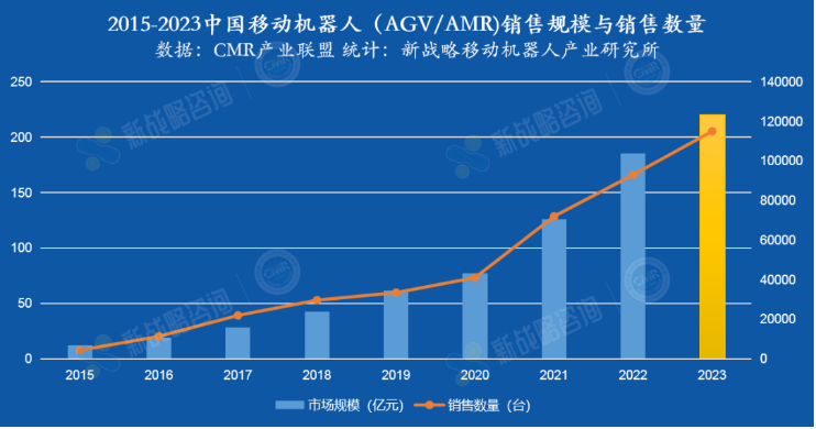 圖表:2015-2023中國AGV/AMR銷售數量與市場增長率