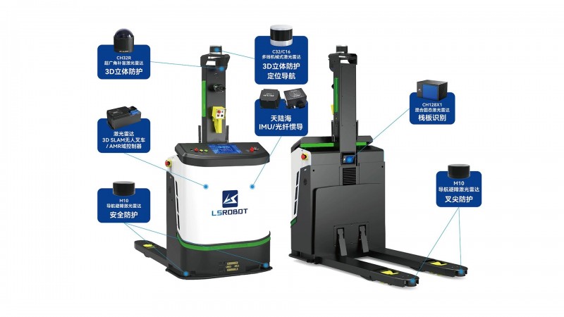 分別置于車頂、中、底及叉尖的激光雷達,從上至下覆蓋3D定位導(dǎo)航、立體防護、棧板識別、防撞及叉尖保護功能,同時又做到全方位感知低位至高位障礙物,實現(xiàn)360°無死角立體防護,預(yù)警潛在風(fēng)險,確保安全無憂。
