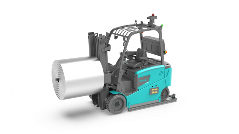 勱微E系列平衡重式無人叉車搭載弧形自適應夾具,夾緊物料后可連續360°旋轉,便于交換作業,廣泛用于造紙、紙箱、包裝、印刷等行業無托盤搬運。