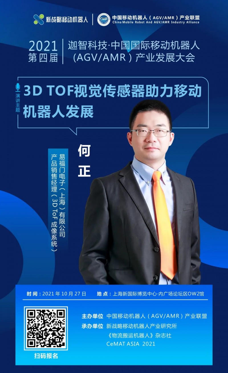 10月27日,在中國移動機器人(AGV/AMR)產(chǎn)業(yè)聯(lián)盟主辦的《第四屆國際移動機器人大會》上,易福門電子(上海)有限公司產(chǎn)品銷售經(jīng)理何正將帶來“機器人之眼:3D ToF相機帶來的無限可能”主題分享,敬請期待!
