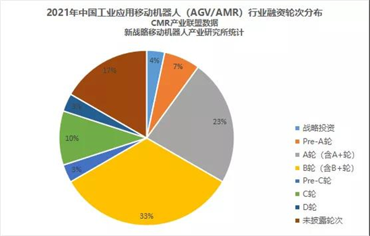 從融資輪次看,2021年工業應用移動機器人領域,戰略融資1起,占比為4%;Pre-A輪2起,占比7%;A輪(含A+輪)7起,占比23%;B輪(含B+輪)10起,占比33%;Pre-C輪1起,占比3%;C輪3起,占比10%,D輪1起,占比3%;5起未披露輪次,占比17%。