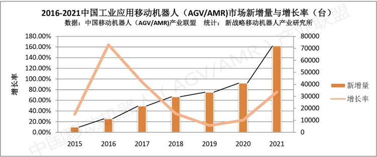 圖表:2016-2021中國市場工業(yè)應(yīng)用移動(dòng)機(jī)器人(AGV/AMR)新增量(臺(tái))與增長率