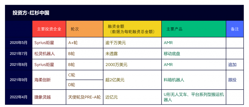 2020年以來,紅杉中國在工業(yè)應用移動機器人行業(yè)中共參與了6起融資事件,被投企業(yè)主要產(chǎn)品覆蓋了移動機器人的移動底盤、無人叉車以及AMR等,企業(yè)專注市場領域從海內(nèi)囊括到海外,包括上文提及的“海歸”Syrius炬星、專注于“箱式倉儲機器人”的海柔創(chuàng)新,以及“移動底盤專家”松靈機器人和“打破傳統(tǒng)叉車固化設計”捷象靈越。