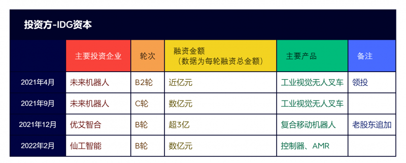 2021年4月至2022年2月期間,IDG資本在移動機器人領域投資了未來機器人、優(yōu)艾智合和仙工智能三家移動機器人企業(yè)。