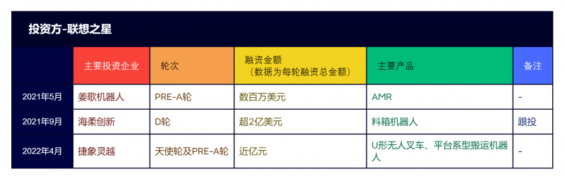 近兩年,聯(lián)想之星在工業(yè)移動機器人領域投資了三家企業(yè),包括箱式倉儲機器人科技企業(yè)海柔創(chuàng)新、機器人通用底盤松靈機器人、AMR機器人公司姜歌機器人,基本上都是從天使輪開始切入。